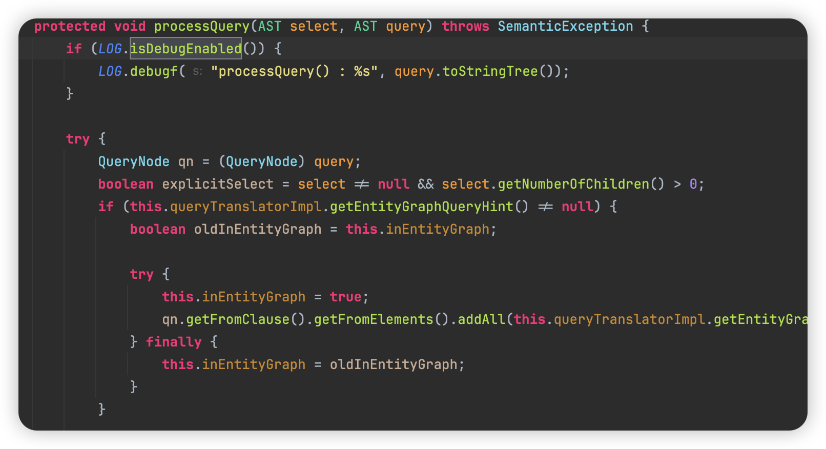 回到调用类HqlSqlWalker,注意到使用的 LOG 其实是经过 hibernate 封装的